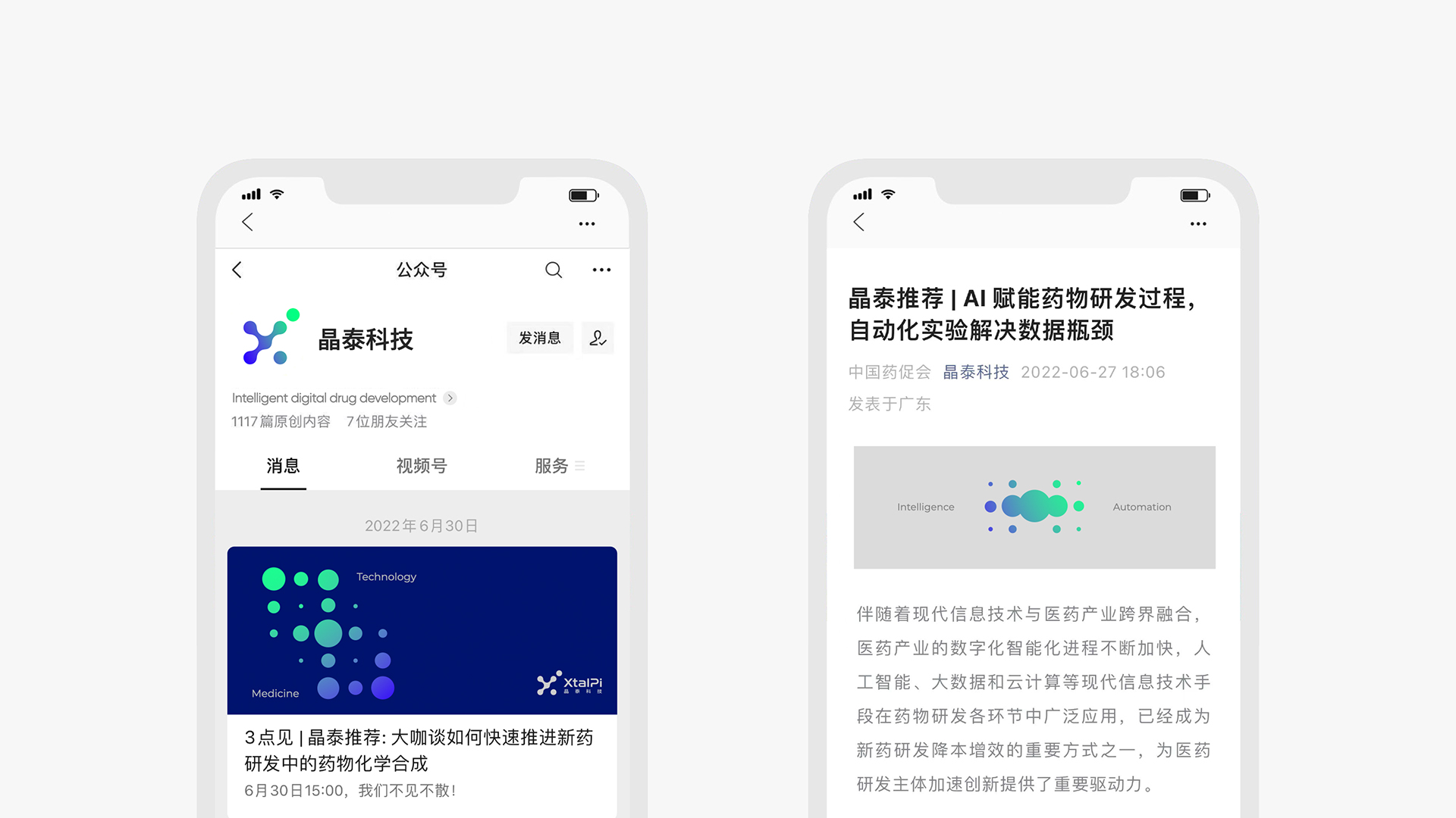 在量子計算相關的視覺設計中,煥識延續晶泰科技原有品牌資產,基于Pi(π)所代表的技術探索精神,構建嚴謹的網格系統,將分子基礎圖形元素與流動的線條結合,既體現量子技術的精準與有序,又彰顯AI技術的靈動與智能,這一設計思路與量子計算logo設計的核心需求高度契合,讓抽象的量子技術變得可觸可感。在色彩搭配上,煥識保留品牌原有色相,提升色彩飽和度與亮度,將洋溢著生機和活力的綠賦予藥物發現,將嚴謹科學的藍賦予化學服務,藍色與綠色通過漸變的方式融合,既增強了視覺沖擊力,也反應出品牌面對未來創新的情緒,完美契合量子科技VI設計的行業特質。
