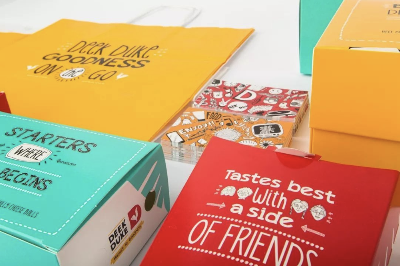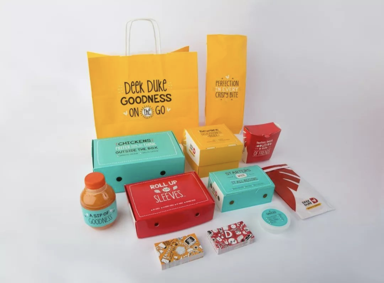 這是一家國外的炸雞快餐店外賣包裝設計,其外賣包裝采用卡通風格的插畫設計,運用鮮艷且豐富的色彩搭配,深受低年齡層消費者的喜歡。