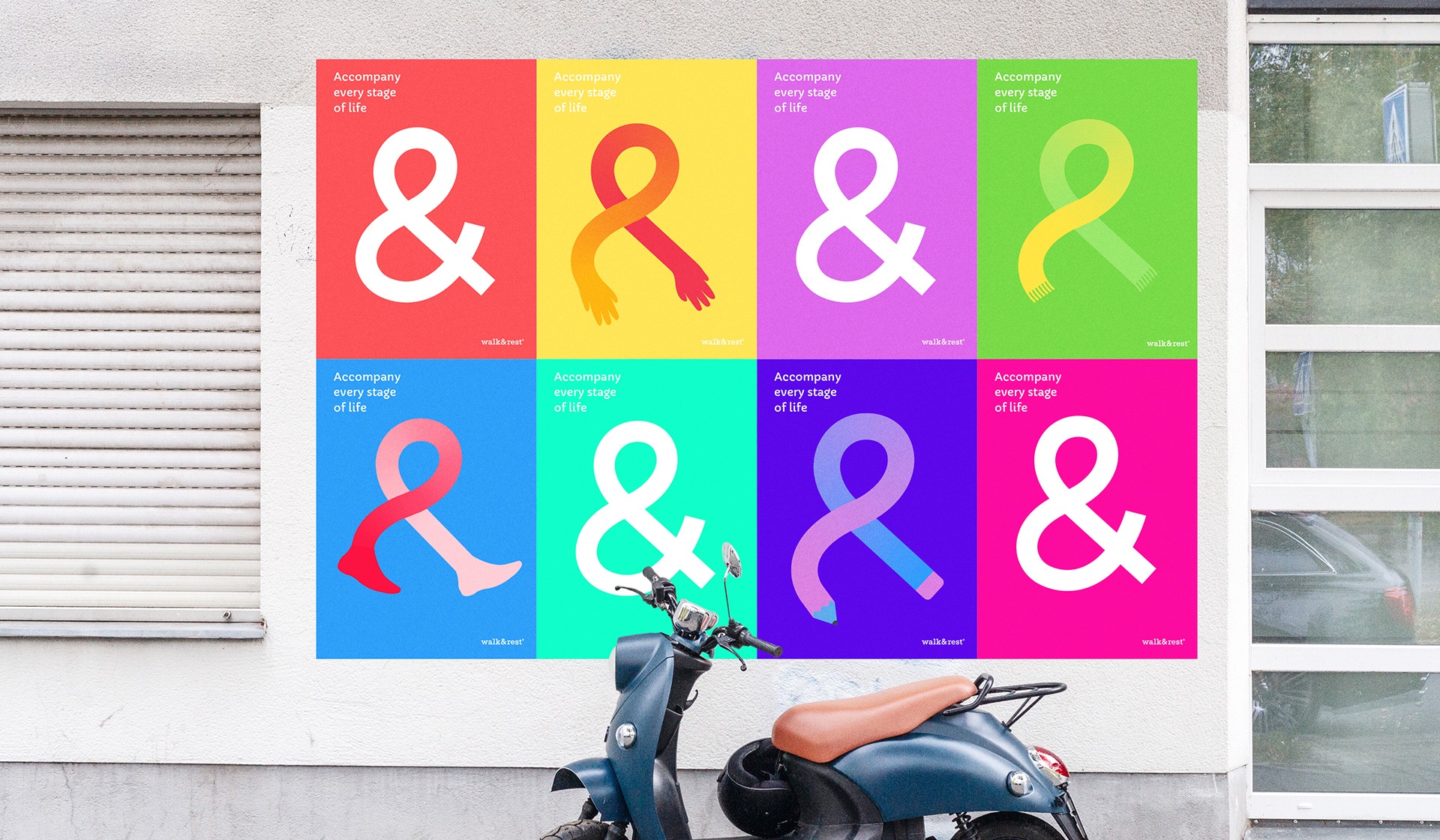解決方案:煥識品牌創意機構受walk&rest的邀請為其針對中國市場需求進行全方位的品牌戰略定位規劃與品牌形象設計煥新及整套vi設計等工作。我們通過前期的品牌探索及市場研究提出品牌定位方向為“陪伴人生每一階段”,并將品牌定位轉化為品牌視覺形象設計語言發展至整套vi設計系統中。同時采用現代的設計手法與品牌文化結合,透過純度較高的繽紛色彩與提煉出來的超級符號“&”記憶形成強烈的品牌印象,采用輕松自由的圖形延展方式,準確的傳達walk&rest的品牌定位“陪伴你人生每一階段”的訊息,期望將walk&rest從專業、成熟、理性的品牌印象轉變為輕松、自由、樂趣、陪伴的品牌印象,更貼近中國消費者,形成獨有品牌資產。
