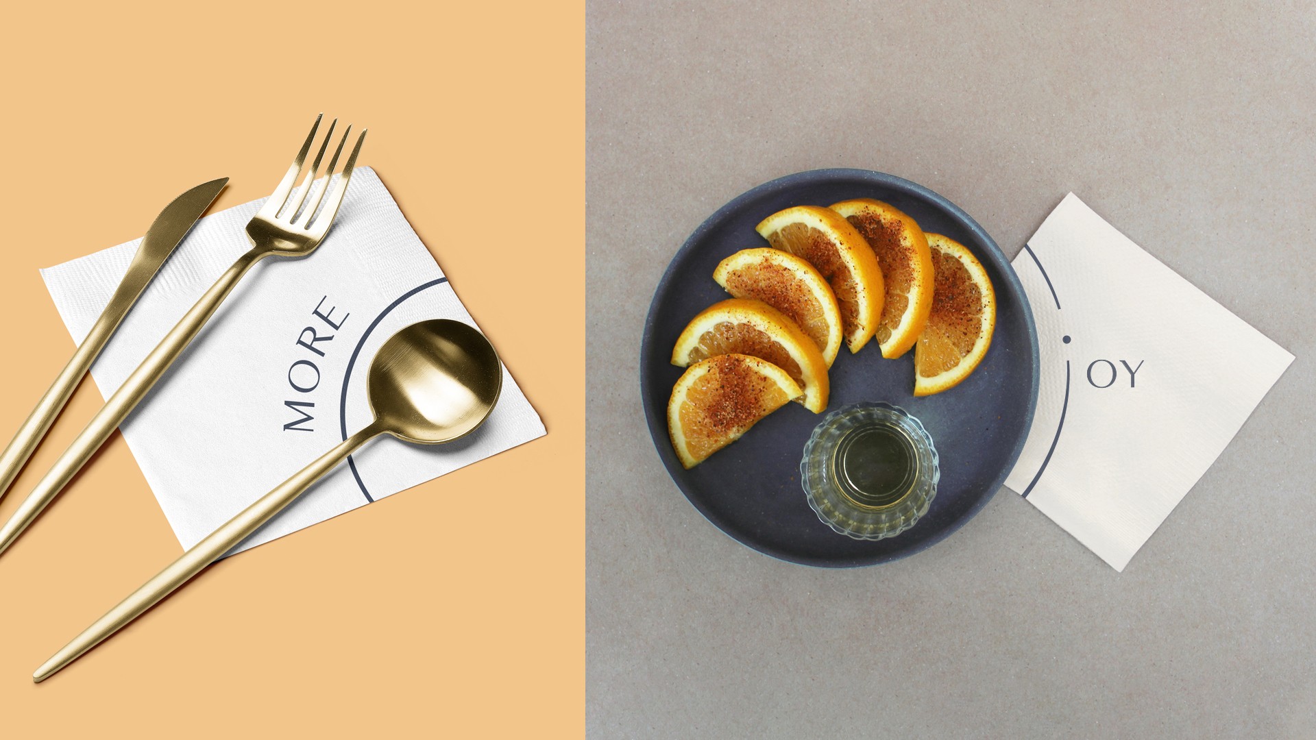 在前期的品牌研究中我們做了大量的診斷分析,并結合品牌定位方向提煉出品牌視覺概念。MOREJOY的靈感來自于對享受完美生活的想象,標識通過圓的元素構成,整體呈現高級、現代、有品質感的表現。在標識構成中,圓環是“MORE”的抽象表達,亦是JOY中“J”的延展呈現,它象征著無限的可能性,也將各種餐具的頂視圖以簡圖的方式呈現出來,這傳達著MOREJOY為客戶帶來無限的享受與快樂的經營理念。