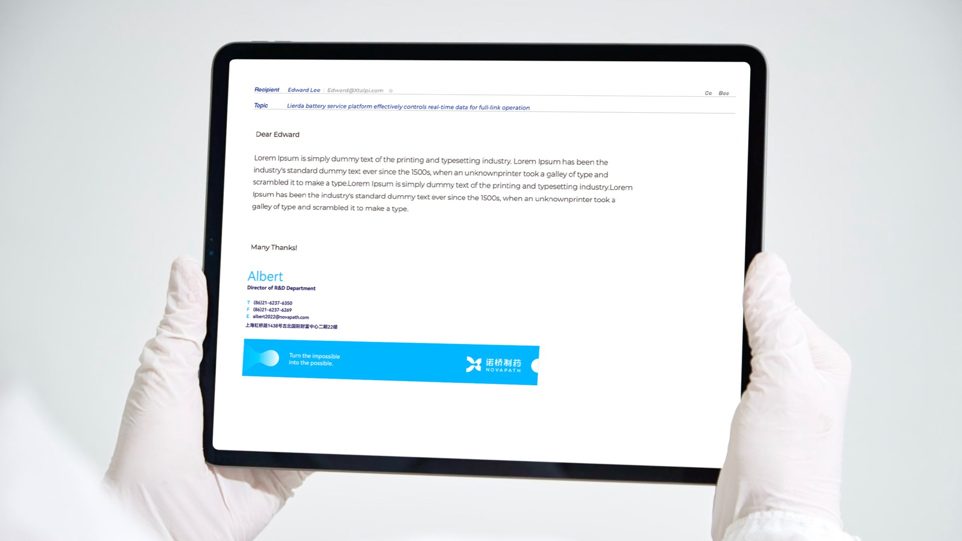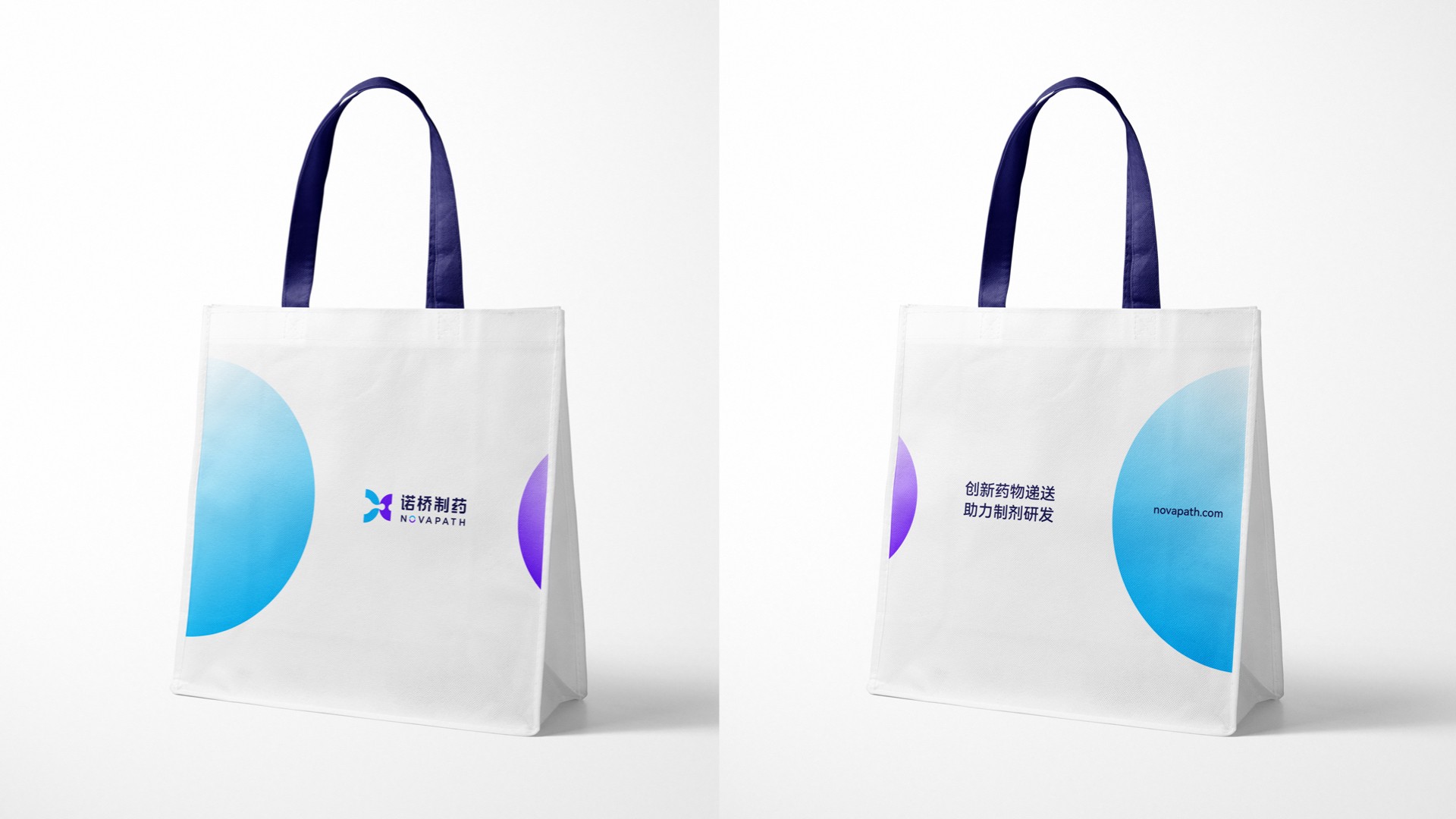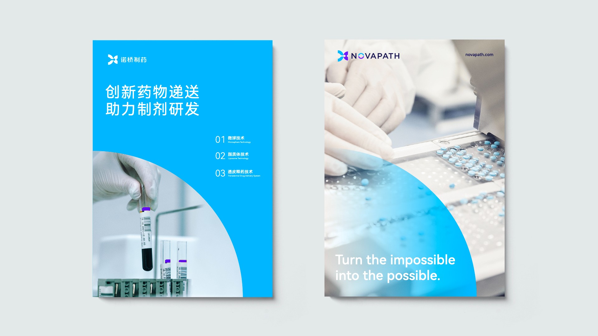 在諾橋制藥品牌塑造項(xiàng)目的初期,煥識(shí)團(tuán)隊(duì)與諾橋內(nèi)部的高層、市場(chǎng)相關(guān)人員進(jìn)行了多次的深度訪談?wù){(diào)研工作,深入了解到諾橋制藥努力成為中國(guó)最具價(jià)值的全球一流的藥物遞送創(chuàng)新技術(shù)公司的企業(yè)愿景。經(jīng)共同討論,提煉出了關(guān)鍵性描述:諾橋制藥品牌就像一座橋梁連接了成功的彼岸,把已有技術(shù)發(fā)展為更好的技術(shù),把未能達(dá)到的技術(shù)變成可能。我們?cè)谶@關(guān)鍵性描述定義的指導(dǎo)下,為諾橋制藥提出了全新的品牌視覺(jué)概念語(yǔ)言:“成功新通道”。根據(jù)這一概念,我們開(kāi)發(fā)了諾橋制藥品牌的視覺(jué)形象。其中,諾橋的圖形標(biāo)志靈感來(lái)自于諾橋團(tuán)隊(duì)分享的科研資料中“脂質(zhì)體技術(shù)”在靶向給藥過(guò)程中的藥物分子遞送狀態(tài),我們進(jìn)一步對(duì)此抽象概念語(yǔ)言進(jìn)行了可視化的具像呈現(xiàn)。用左右兩邊半圓之中的液體流動(dòng)輪廓表現(xiàn)了在藥物遞送過(guò)程中有方向性的、具有穿透感的藥物遞送瞬間。同時(shí)此圖形標(biāo)志整體也構(gòu)成了字母“N”的形狀,賦予諾橋制藥(NOVAPATH)更多的品牌專屬性和識(shí)別性。